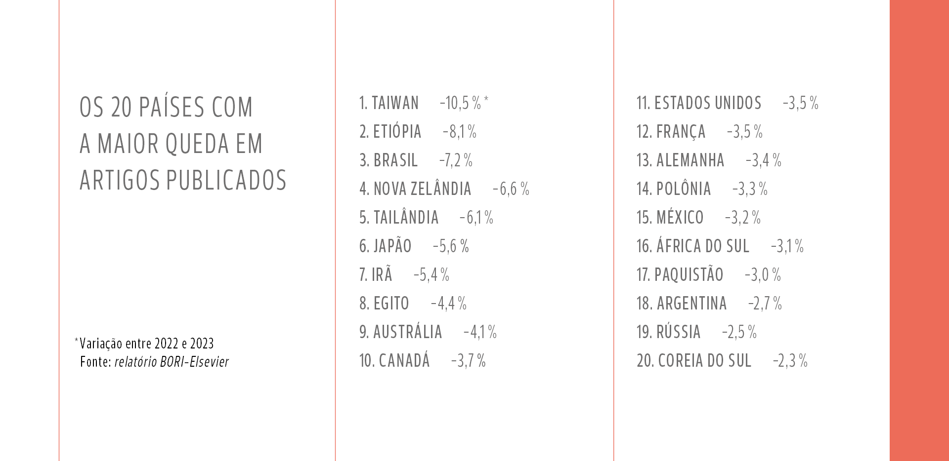 “Sabemos que o volume de publicação de artigos de um país reflete, dentre outros fatores, o volume de investimento em pesquisa científica de alguns anos atrás. Isto é, são efeitos de médio prazo”, afirma Dante Cid, vice-presidente de Relações Institucionais para a América Latina da Elsevier. “Portanto, nossa expectativa é de que, diante de um melhor nível de investimentos dos últimos anos, a produção nacional retome o crescimento em breve”, conclui. Taiwan, Etiópia e Brasil lideram a lista das 20 nações com maior variação negativa na produção científica entre 2022 e 2023. Em sentido contrário, Emirados Árabes, Iraque e Indonésia apontaram crescimento superior a 15% no mesmo período.