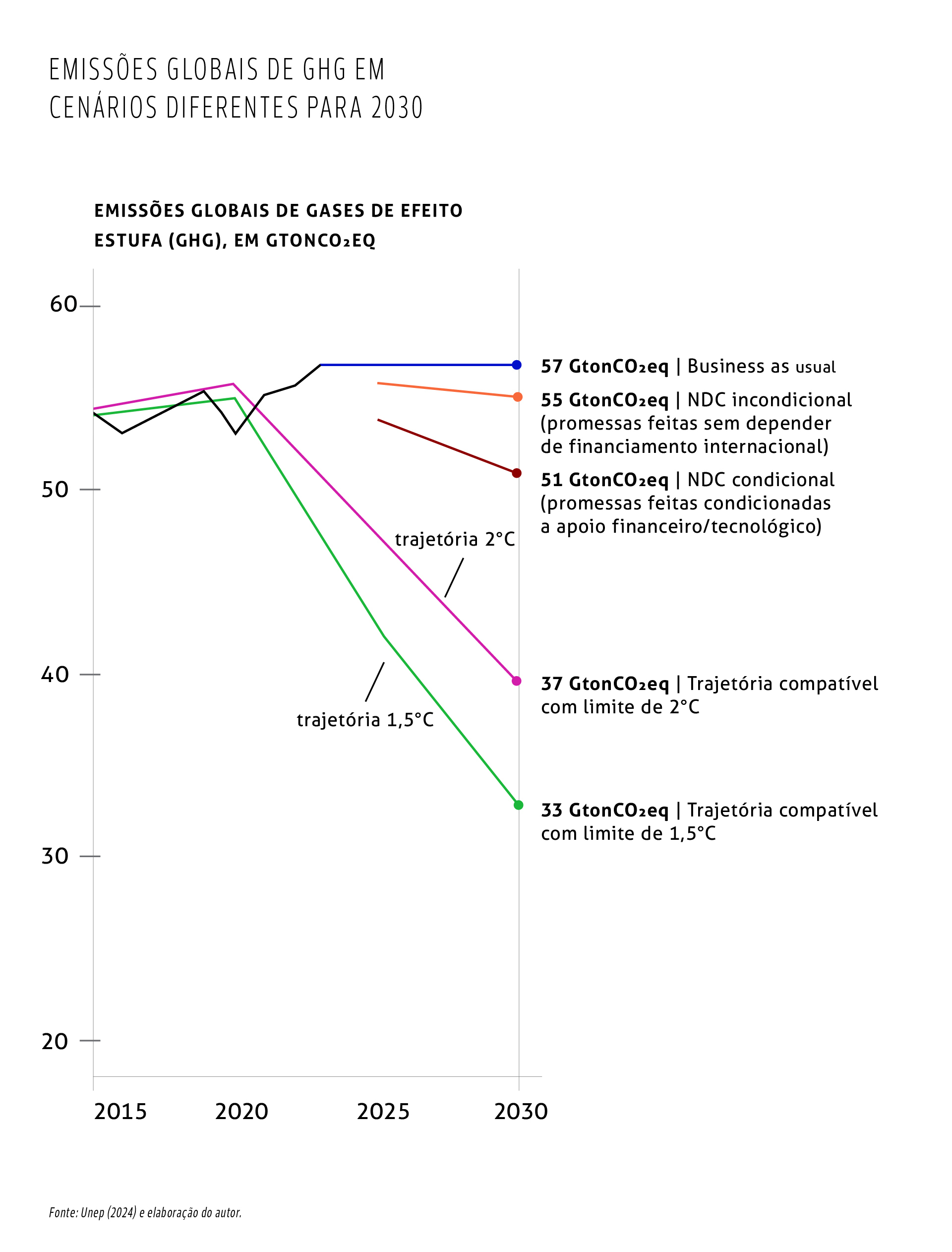 A continuidade das tendências atuais (“business as usual”) levaria a um aumento de temperatura da Terra de 3.1 oC até o fim do século. A implementação continuada das NDC (condicional e incondicional) limitaria este aumento a 2.8 oC (Unep, 2024).