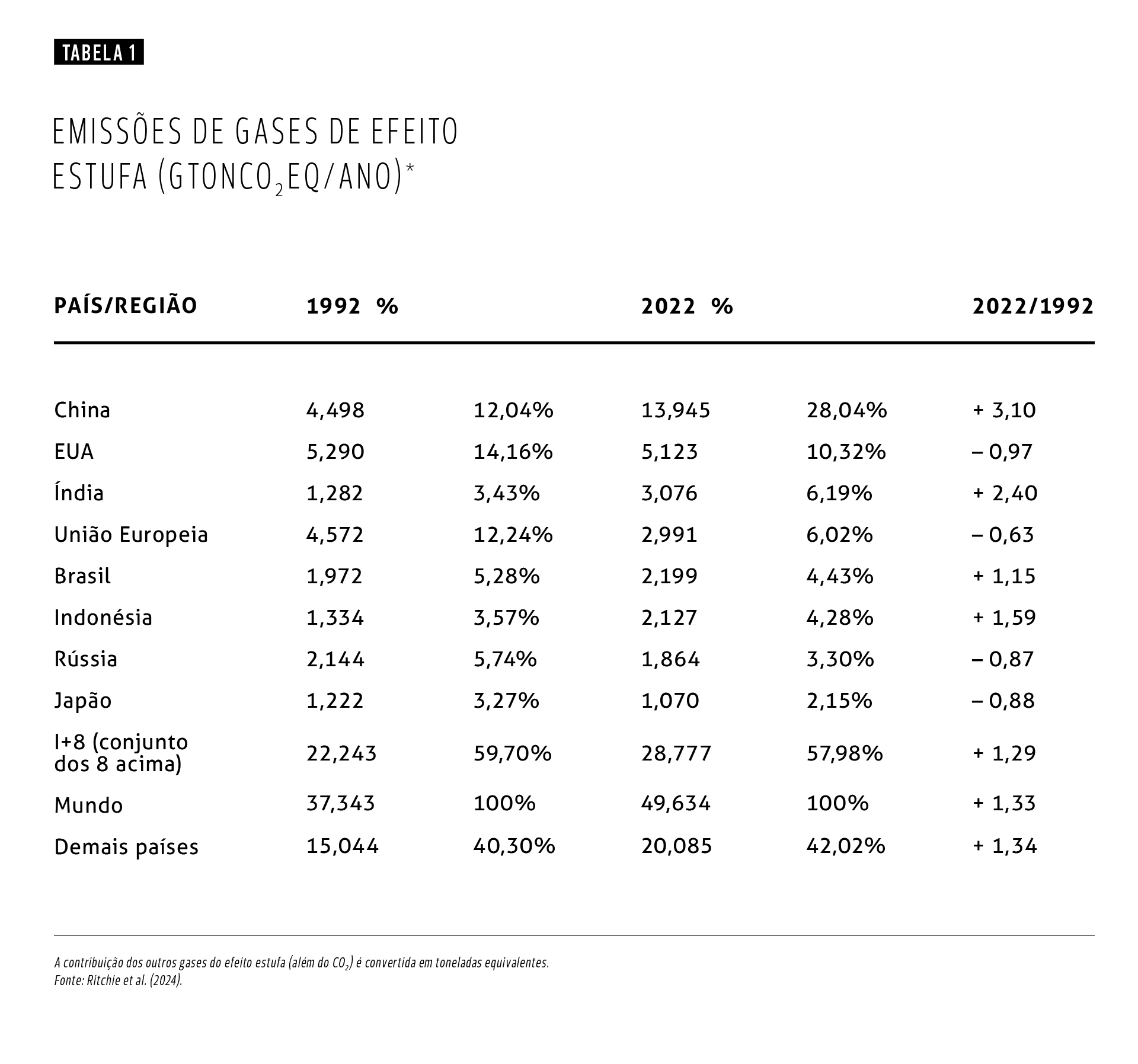 No mundo como um todo, as emissões aumentaram 33% no período 1992-2022.