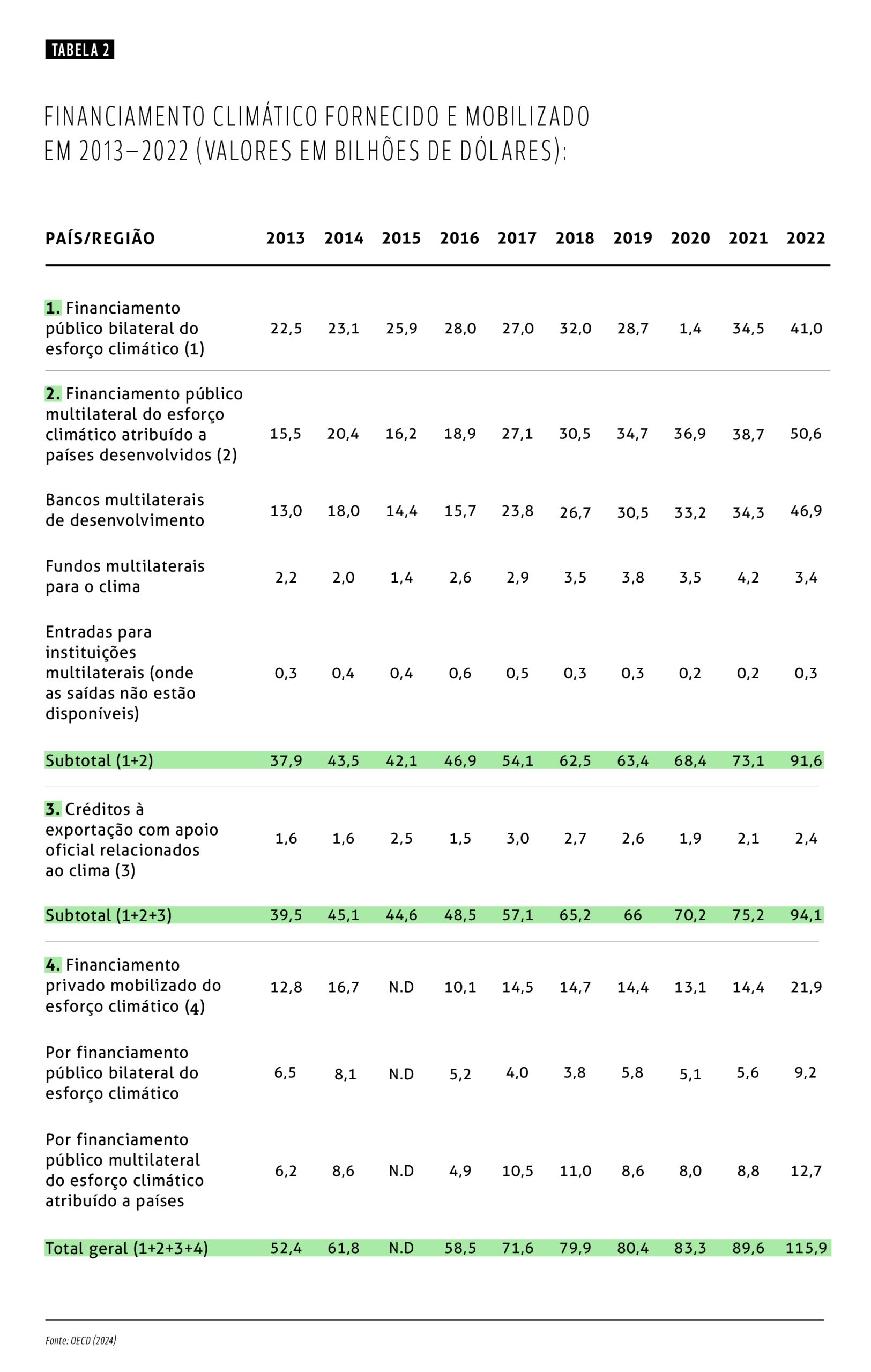 A meta dos 100 bilhões de dólares só foi atingida em 2022. A Tabela 2 mostra a evolução dos financiamentos climáticos de 2013 a 2022 (OECD 2024):