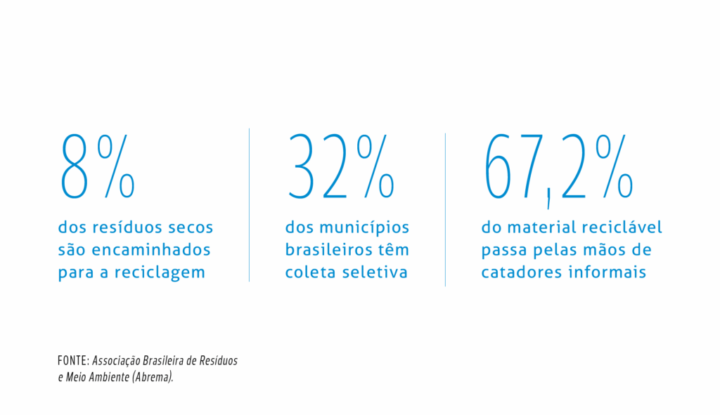 O Brasil produz cerca de 80 milhões de toneladas de resíduos por ano, 382 quilos por habitante. No entanto, apenas 8% dos resíduos secos das cidades brasileiras seguem para a reciclagem, um porcentual ainda baixo — e potencial gigantesco para o meio ambiente e a geração de emprego e renda. Ainda estigmatizados, os catadores de recicláveis carregam boa parte da responsabilidade pela economia circular, mas a organização em cooperativas ganha espaço, com mais segurança e dignidade para os trabalhadores.