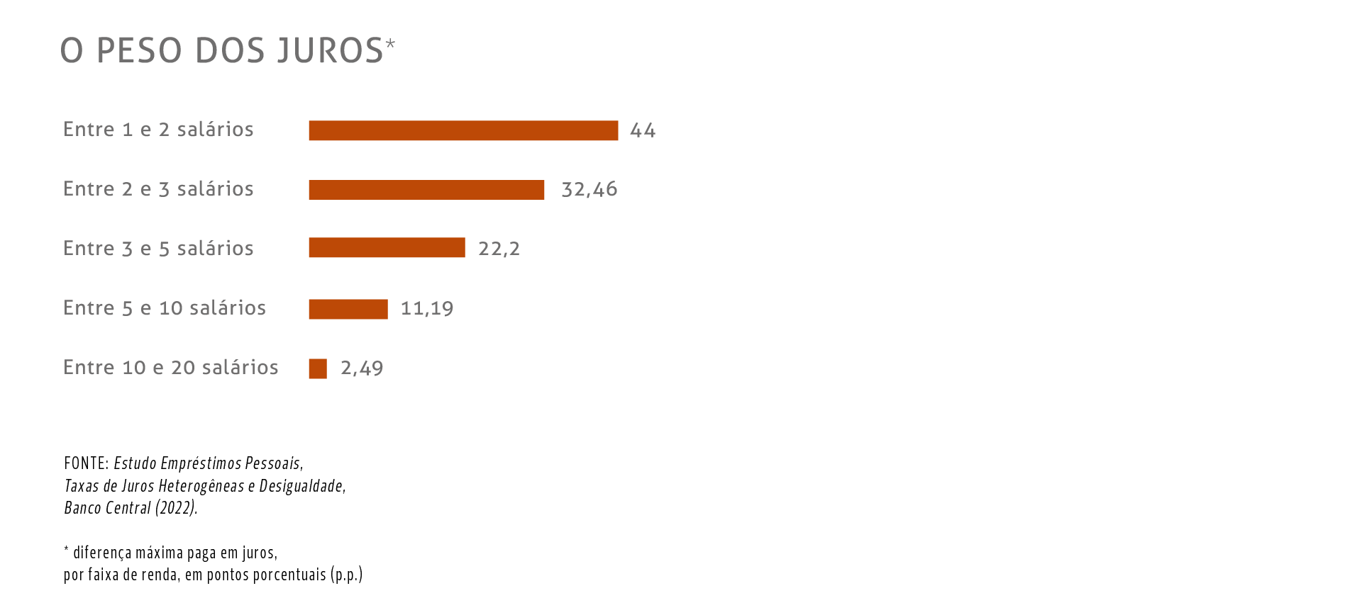 A conta foi feita por economistas e está num estudo publicado pelo próprio Banco Central (BC). Tomadores de crédito que ganham de um a dois salários mínimos pagam de 28 a 44 pontos porcentuais (p.p.) a mais nos juros do que aqueles que ganham mais de 20 salários mínimos. A conclusão é da pesquisa Empréstimos Pessoais, Taxas de Juros Heterogêneas e Desigualdade, que cruza dados do Sistema de Informações de Crédito (SCR) do BC com a Relação Anual de Informações Sociais (Rais) de 2013 a 2019, com dados de mais de 1 milhão de pessoas. Os resultados também sugerem que eliminar ou diminuir essas discrepâncias poderia melhorar significativamente o bem-estar e o poder de compra, especialmente de trabalhadores pobres e informais.