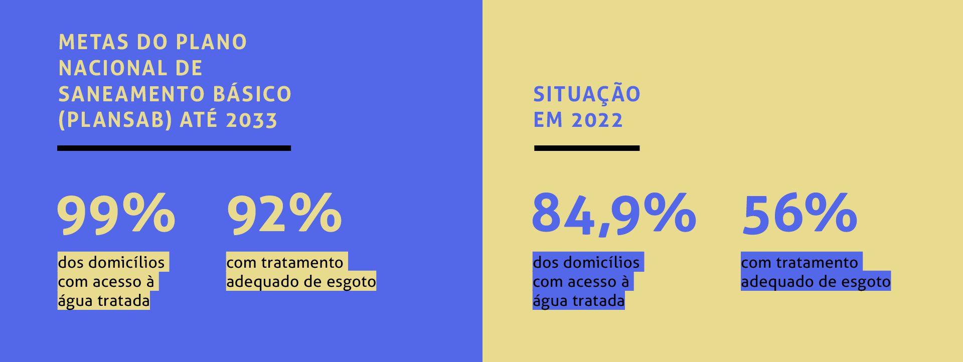 O dilema mais significativo, dizem especialistas, está, de fato, em alcançar, até 2033, a universalização do acesso a água potável e esgoto tratado no Brasil. A meta foi estabelecida pelo Plano Nacional de Saneamento Básico (Plansab), em 2013, prevendo ainda as ações de limpeza urbana e drenagem de águas pluviais — dilema de cidades ribeirinhas, como Belém, no Pará. Os objetivos do Plansab são de 99% de residências com acesso à água e de 90% com tratamento de esgoto, até 2033.