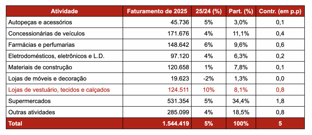 Isso se vê, em parte, nos dados já consolidados pela Entidade para o intervalo entre janeiro e setembro, nos quais as lojas de vestuário e acessórios foram os que apresentaram maior crescimento (11%) no acumulado do ano, seguidas por autopeças, eletrônicos e supermercados, com elevações de 6% no período.