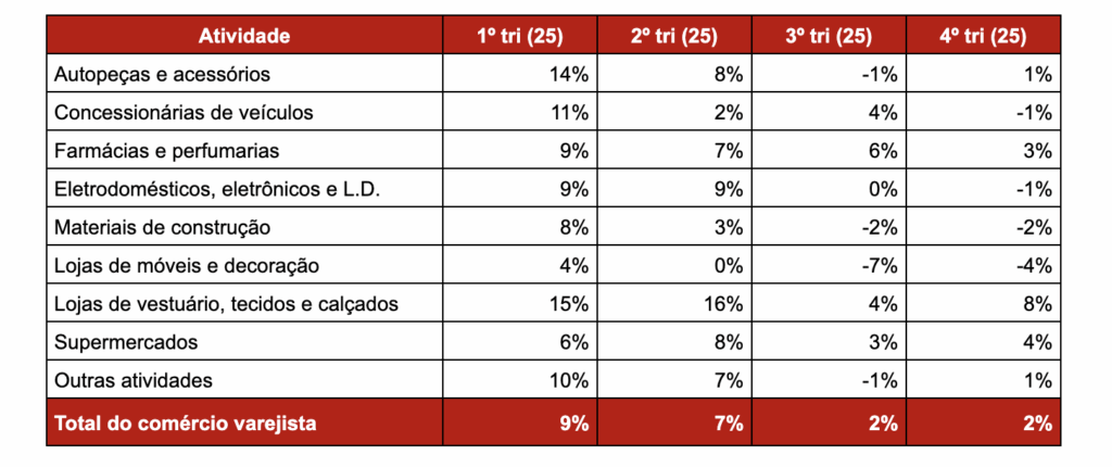 Os dados da FecomercioSP mostram como o País viveu semestres diferentes neste 2025. Nos primeiros três meses, o varejo paulista cresceu 9%, estimulado pelas lojas de roupas e, sobretudo, pelas vendas de automóveis.