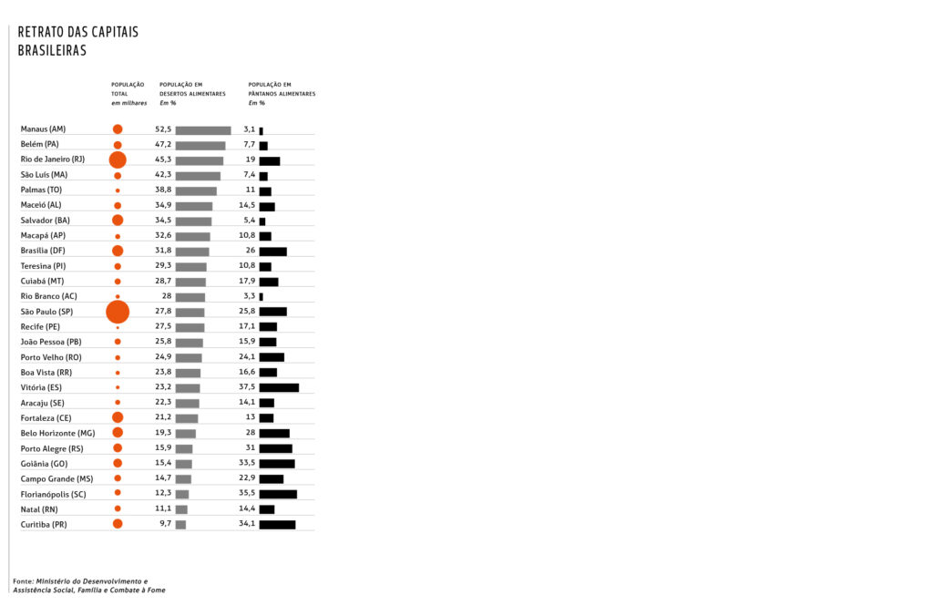 O MDS identificou, ainda, que em 91 cidades com mais de 300 mil habitantes, onde vivem 77 milhões de brasileiros, cerca de 25 milhões residem em áreas de desertos alimentares. Esse montante corresponde a 32,3% da população total dos municípios analisados — ou seja, um a cada três brasileiros nessas cidades tem dificuldade para comprar alimentos saudáveis. Além disso, cerca de 15 milhões residem em pântanos alimentares, número que corresponde a 19% da população total dos 91 municípios analisados. Resumindo: cerca de uma a cada cinco pessoas nesses locais acessa facilmente os ultraprocessados.