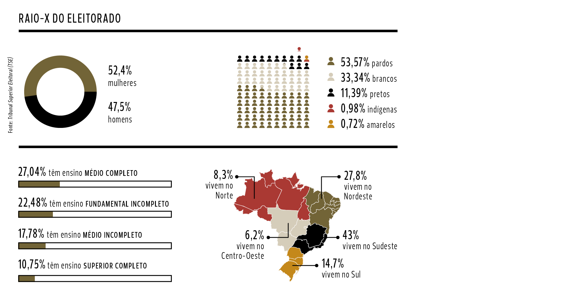 Um Brasil rachado. De um lado, a esquerda e boa parte das mulheres, com maior rejeição à família Bolsonaro — e elas são 80 milhões, o que representa 52% do eleitorado. A esquerda e as mulheres vêm acompanhados do Nordeste, que tem quase 28% do total de eleitores, e a população mais pobre. Segundo pesquisas de opinião realizadas às vésperas do segundo turno de 2022, esse grupo de pessoas ajudou a eleger Lula.
